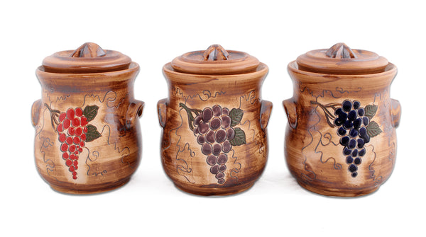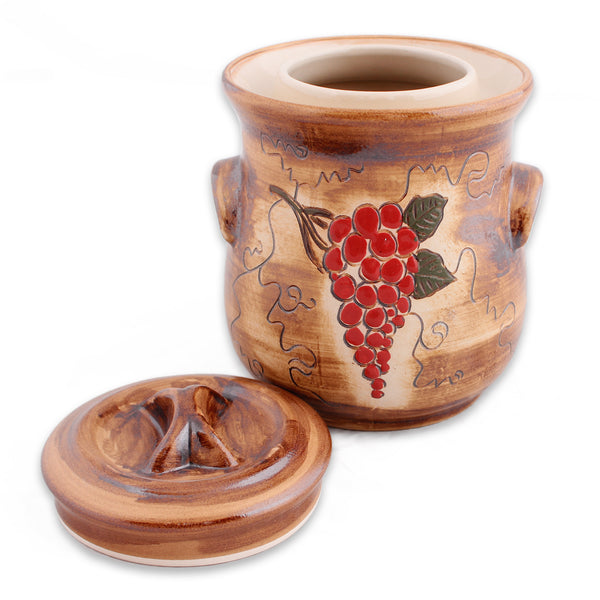 This crock features a grape design on the side. We offer 6 different colors of grapes - red, light purple, dark purple, pink, orange and green.