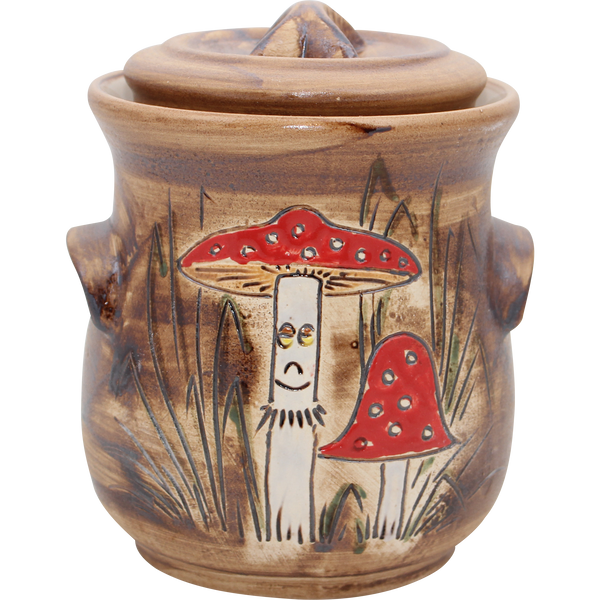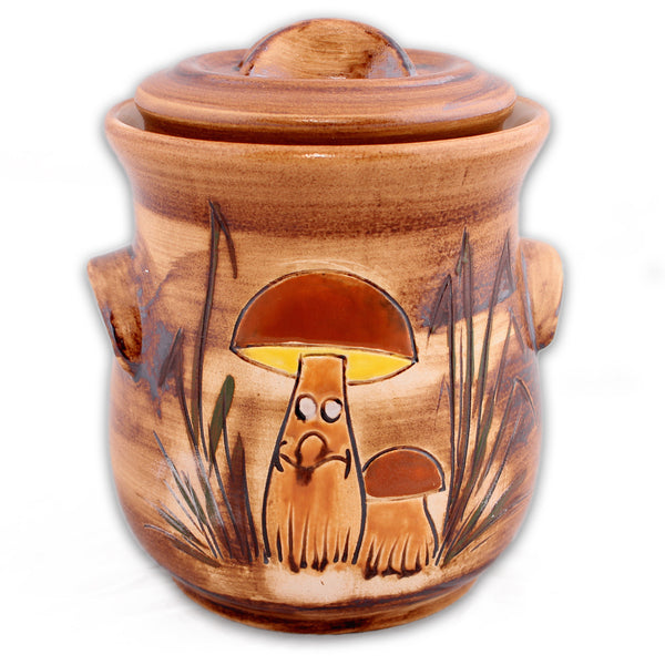 The Mushroom design on this fermenting crock adds a whimsical touch. Mushroom hunting is a common pastime in Poland, which is why you find the mushroom depicted on many Polish folkart pieces. You can choose either Red or Brown mushrooms for the crock. It has brown mushrooms on both sides. The mushrooms may or may not include a face as each individual crock is unique.